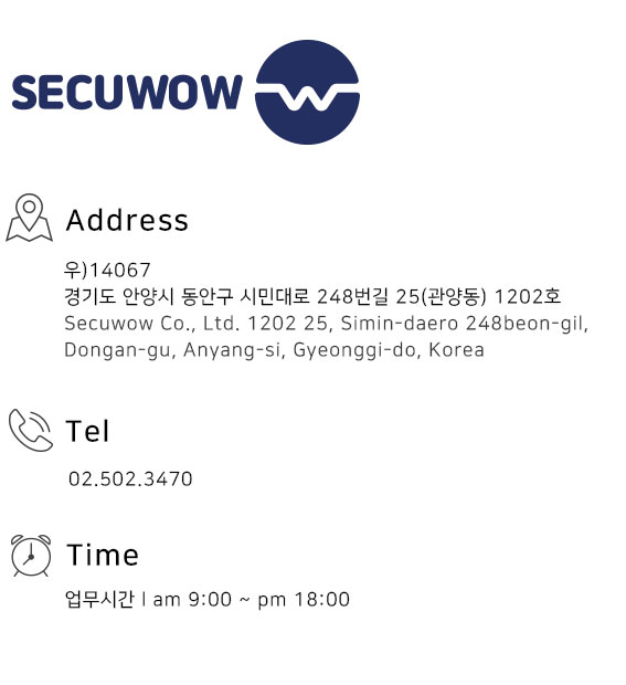 대표자 : 왕주상 / 사업자등록번호 : 414-86-02104 / 전화번호 : 02-502-3470 / Fax : 02-502-3471 / 이메일 : sales@secuwow.com